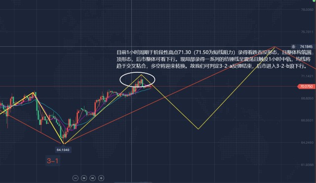 3-2浪细分:目前1小时周期于阶段性71.30附近收阴构筑看跌吞没形态,整体构筑圆顶形态,后市整体可看下行。现局部录得一系列的纺锤线呈震荡且再次触及1小时中轨,ma均线将趋于交叉粘合,多空将再次迎来转换!1小时周期的RSI并未随行情新高而创新高,呈顶背离,后市可看下行!故我们可判定3-2-a浪已结束,现行情处于3-2-b浪反弹之中!空单可于现价71.50附近跟进,止损带72.80上方,中长空持有看65.00!