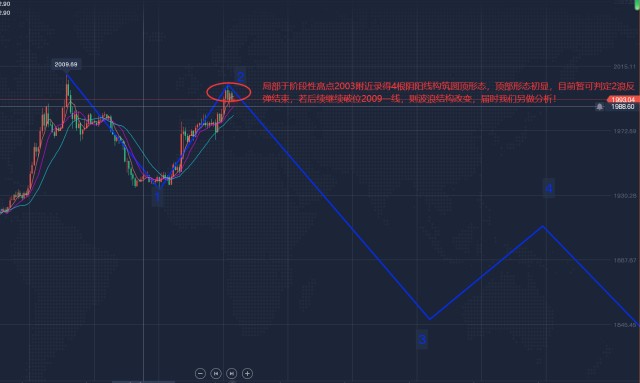 小浪细分:由之前分析可知,因行情于阶段高点录得反转形态,大一级别的X-A浪反弹结束,目前行情处于X-B回落之中,且可继续细分成锯齿浪abc结构,如图中蓝色线所示。依据现有行情,我们可将a浪再次细分成5浪结构,因行情再次上行破位1984一线,故小浪结构需相应作出调整,行情已走完1浪。现行情处于2浪反弹之中。根据波浪理论可知:2浪反弹理论顶部位于1980附近。结合1小时周期的盘口信号,我们可知行情局部反弹已结束,咱可判定2浪反弹结束,若后续再次破位2009一线,则小浪结构破坏,我们再另做分析!