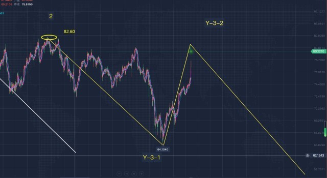 综上:目前行情整体仍处于大空趋势之中,后市可看下行。建议整体仍以高空为主,低多为辅。 黄金操作建议: 建议可于现价1990跟进空单,止损1998,中长线空持有! 原油走势分析 大一级别的波浪结构:由之前分析可知,目前行情整体处于Y-3浪下行之中,因行情再次上破80.90一线,小浪结构破坏,我们需对小浪重新进行划分。依据现有可知,我们可将行Y-3浪细分成5浪结构,如图中黄色线所示,现行情正处于Y-3-2浪反弹之中,根据波浪理论可知:2浪一般会逾越1浪起点,故此次反弹顶部暂看82.60下方,今日行情高开81.40附近,目前暂判定Y-3-2反弹结束,后市仍可继续看大空。建议80.80附近跟进空单,止损81.70,中长空持有!