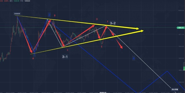 小浪细分:因行情再次上行破位1984一线,根据波浪理论可知:4浪进入2浪的价格区间,故我们需对3-1浪的小浪重新进行划分,即3-1-5浪于1948附近提前结束,目前行情整体处于3-2浪反弹之中。为方便分析,我们可将3-2浪细分成锯浪abc结构,如图中黄色线所示。根据波浪理论推演可知:3-2浪的理论反弹顶部位于1984附近,且同时c浪一般等长于a浪即c浪的理论顶部位于1955+27=1982附近,且1984为目前强阻力位,故我们有理由相信行情将于1984附近再次迎来反转结束3-2浪。因行情再次破位1987一线,故大浪结构需对应做出调整,即行情仍处于3-2浪反弹之中。目前1小时周期和4小时周期构筑的收缩三角形破位在即,后市仍可继续看大空!