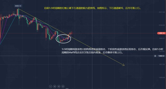 盘口分析:1小时周期局部于1990附近录得大阳构筑塔形底部形态,于阶段性底部录得反转形态,短线回落结束,后市可看上行;后续接连录得4根纺锤线和小实线呈震荡上行破位下行通道的阻力趋势线,如图中黄色线所示,后市整体可看上行。4小时周期于阻力位1990附yi近录得一系列的实线呈震荡筑圆底,后市可看上行。目前1小时周期的Ma均线走出交叉粘合指向看涨,后市整体可看上行。1小时周期和15分钟周期的KDJ交叉向上指向看涨,短线仍可看上行;但目前1小时周期的KDJ已处于超买状态,后市需关注其超买状态的解除方式!