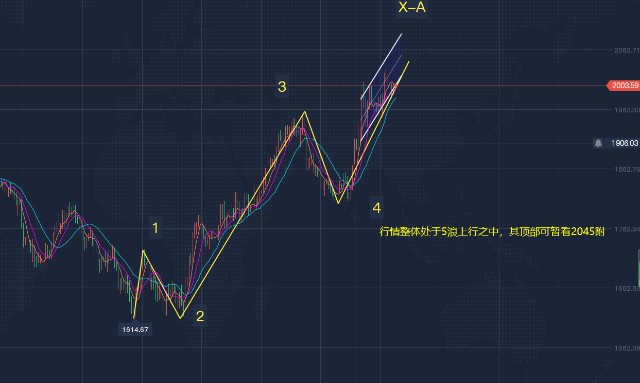 大一级别的波浪结构:因行情再次破位前高2009一线,故大一级别的波浪结构仍需做调整,即行情仍处于X浪的细分浪X-A浪之中。为方便分析,我们可将X-A浪继续细分成5浪结构,如图中黄色线所示且行情正处于5浪上行之中。根据波浪理论可知:5浪一般于1浪呈斐波拉契倍数,故目前可暂看2倍于1浪的位置2034和2.618倍于1浪的位置2070,若行情后续继续破位2079一线,则说明大级别的X浪结构破坏,即行情整体并不处于双重锯齿浪结构之中而是新一轮的5浪结构之中,届时我们再另做分析!X-A浪的细分浪5浪顶部需结合盘面实际给出!