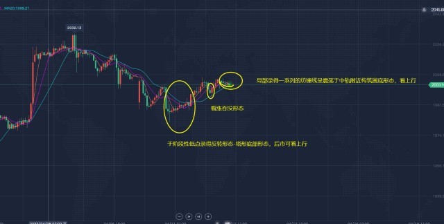 盘口分析:1小时周期局部于阶段性底部1990附近录得大阳构筑塔形底部形态后,后市录得一系列的k线呈震荡上行。目前行情整体站稳于小时中轨,如图所示:行情局部于中轨附近录得看涨吞没形态后,后续再次于中轨附近录得一系列的纺锤线震荡构筑圆底,局部可看上行。2001作为前市多空转换较为频繁的点位,根据极性转换原则,目前可视为短线支撑,今日可依托该点位继续看上行。4小时周期局部于1990附近构筑圆底形态,现录得一系列的纺锤线震荡上行破位中轨,后市仍可继续看上行。日线周期局部录得中阳,上行通道维持良好并未破位,可继续看上行