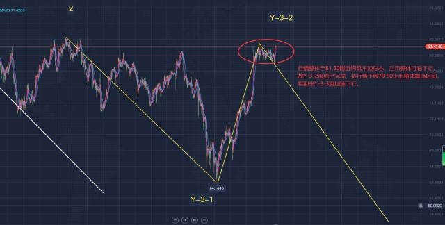 波浪结构细分:由之前分析可知,目前行情整体处于Y-3浪下行之中,依据现有行情,我们可将Y-3浪继续细分成5浪结构,如图中黄色线所示,现行情处于Y-3-2浪反弹之中。根据波浪理论可知:2浪反弹不会逾越1浪的起点,即Y-3-2理论反弹顶部应在82.60下方,若行情上破该点位,则小浪结构发生改变,届时我们再另做分析。现行情整体震荡于81.50-79.50区间,且整体有构筑平顶之势,后市可看下行,故我们可判定Y-3-2浪或已结束,待行情向下走出震荡区间,后市将迎来Y-3-3浪加速下行。