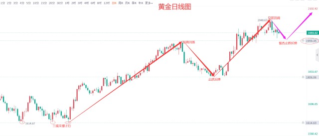 黄金走势分析:黄金日线图上来看,自下方1614三底支撑上涨以来,第一波创高1959后走回调,回调止跌的位置是自2070下跌以来最后一波高点1806附近,然后再度开启第二波涨势创下2048的年度高点,现在行情再度走跌修正,目前下方且关注上行第一波高点1959位置能否止跌反弹。所以大趋势上还是一个偏涨的形态,只不过目前走的是下跌修正浪,若这波修正在1959附近止跌后市将会有再一波的主上升走势并刷新今年2048的高点。所以本月最后几个交易日需要关注1959的重要支撑位,届时本团队会在此位置打算接一波中长线多单去看新高。