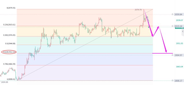 现在黄金价格下破2015这个关键位置,那么接下来我们继续看金价下行,虽然看空,但是不建议直接追空。主要是受数据影响,金价在2038位置加速下行没有止跌迹象,所以技术上还是存在一波反弹修复的,所以稳健等待反弹不破2015再去做空看1976的位置,然后这波深调看能否触及1912的地方。这个需要时间的验证。