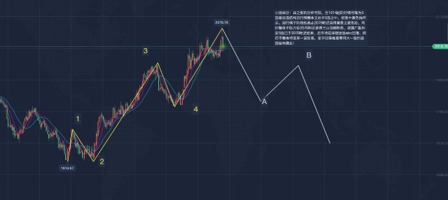 小浪细分:由之前的分析可知,自1614起的行情可视为5浪驱动浪结构且行情整体正处于5浪之中,如图中黄色线所示。因行情于阶段性高点2079附近录得黄昏之星形态,同时整体于阻力位2070附近录得三山顶部形态,故郭广盈判定5浪已于2079附近结束,后市将迎来锯齿浪abc回落,即后市整体将迎来一波回落,至于回落幅度需待大一级的波浪结构确定,不管行情处于何种结构之中,短线回落已成必然,届时于1870附近再抉方向!