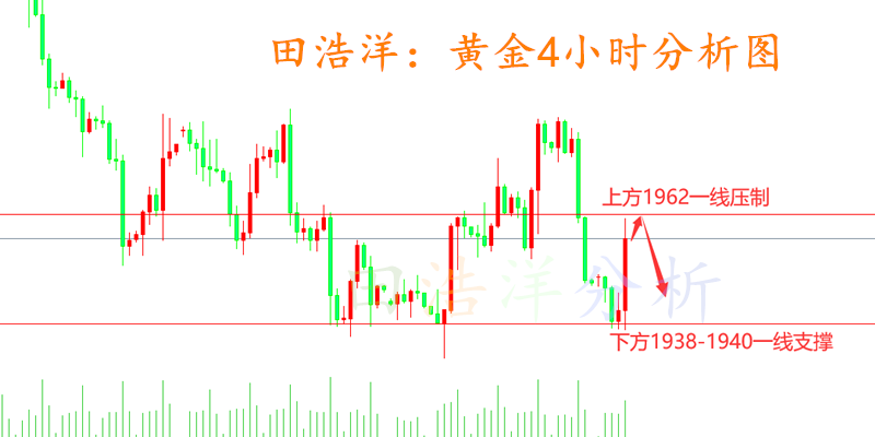 今天白天开盘就开始震荡下行,晚间美盘前最低触及1938附近,此位置也是我周末分析的支撑位置,我也在此位置及时通知实盘多单进场,多单最后也是成功在1956附近全线获利出局,但是随着多头的发力,目前位置最高触及了1962附近,这里是短期的压制位置,午夜不破此位置可以空一波,下方的目标先看1944-1950附近,大趋势我们依旧是以反弹做空为主。 从4小时图来分析,短线还有进一步下行回落空间,今日反抽依托4小时开跌口1960-1962一线继续主空再看回落,午夜没突破1962这里位置之前任何反弹均是做空机会,继续保持顺势参与主基调,具体操作策略我会在盘中提示,及时关注。 1、反弹1960-1962一线空,止损1969,目标1944-1950一线; 文/田浩洋(VX:thy7818)专业国际市场点评,针对实际市场参与者,考虑到部分市场窗口对于实盘交易具有一定的时效性可关注笔者,从而能够选择合适的策略进行操作。对黄金、原油、白银等大宗商品有深入的研究,如果你做单不顺或投资经常资金缩水,那么你可以关注田浩洋本人。