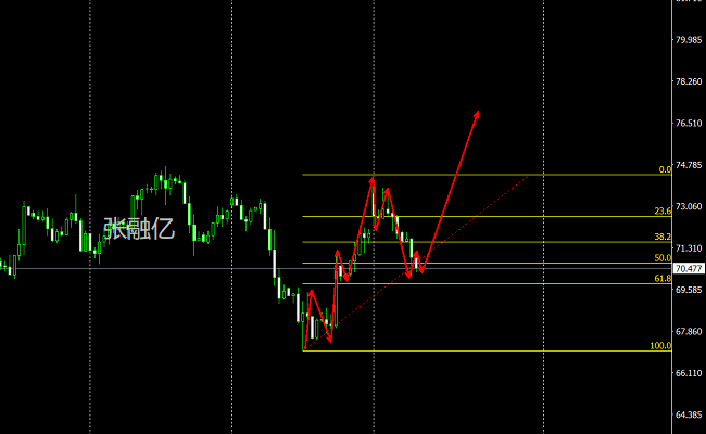 原油周二开盘在71.954美元/桶,开盘后油价出现了高位承压走势,在触及70.1美元/桶水平徘徊。日线走势图上看,油价跳高收低录的大阴线,油价破高后回撤,今日油价延续空头延续下行,但是前期二连阳依旧运行在低位支撑油价。从四小时级别上看,油价目前处于一个低位区间震荡中,分别在63.8-67.0美元/桶形成双底,油价高开后运行在空头加速,空头得到充分的释放,刚好在70.1美元形成反弹,收录长下影线,考虑该位置可能出现趋势逆转。综上所述张融亿总结:原油回撤寻觅支撑,今日操作上考虑回撤布局多单为主,高空为辅,上方关注74.0-74.7美元阻力,下方关注71.1-70.1美元支撑。