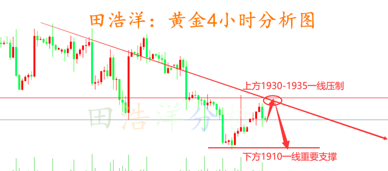 上周下滑至四年来最低。昨日黄金技术面整体依托1920关口向上反弹后压制于1933一线回落震荡收盘,整体依旧压制运行于上周五开跌口1937下方呈现窄幅震荡,日k线再度报收冲高回落长上影,昨日发文明确提到近期金价整体形态上依旧处于压制空头,日线级别一日单阳难成势,1940分水岭不站稳将大概率延续压制空头震荡,昨日全天走势也是完美符合预期,金价亚欧盘反弹回升,美盘冲高承压再度震荡走跌,昨日开跌口1933一线将再度成为近期反弹强阻区域。 从4小时线来分析,下方目标位依旧关注破底,整体形态以及趋势很明显的弱势空头,关注下方1910一线支撑,上方1935-1930一线压制,多空分水岭1940关口,日线级别未突破并站稳此位置之前,任何反弹均是做空机会,依旧保持顺势参与主基调,具体操作策略我会在盘中提示,及时关注。 黄金操作策略: 1、黄金触及1930-1935一线做空,止损1943,目标1920-1915一线; 文/田浩洋(VX:thy7818)专业国际市场点评,针对实际市场参与者,考虑到部分市场窗口对于实盘交易具有一定的时效性可关注笔者,从而能够选择合适的策略进行操作。对黄金、原油、白银等大宗商品有深入的研究,如果你做单不顺或投资经常资金缩水,那么你可以关注田浩洋本人。