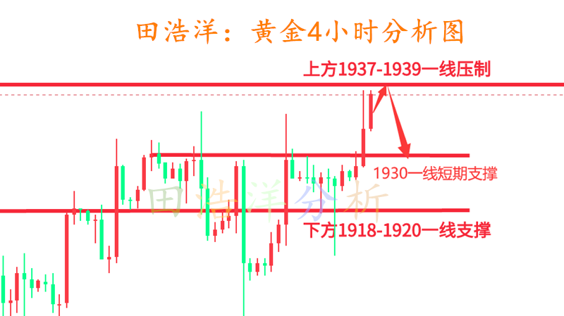 投资是一个不断累积的过程,跟着激动与冲动无法装满自己的口袋,烟花过后叹息幸福来的太快,暴风过后明白生存不易!仓位的控制,是你稳定获利的前提,顺势可以适当放大仓位,逆势可以减少仓位,在看对的行情中赚的更多,在看错的时候亏损最小,投资就是用小亏损去搏大最大的收益,这才是我们要追求的策略。 黄金昨日再次探底回升,并且收于十字星的形态,从目前情况来看,下午两点由于一波砸盘导致黄金冲击上方1938附近,触及此压制时,我们实盘赶紧布局空单,于1930一线成功获利出局,目前处于上方1936附近震荡,但是由于众多因素加持,目前金价显得更加的迷茫,但是万变不离其宗,目前我们暂时先等待,不破上方压制我们依旧可以找机会空单进场,目前价格并没有太多的变化,上方压力和区间模式也基本上等同于前期我们的分析,只有在突破之后,黄金才能走出一定的延续行情,否则的话,市场很有可能会走出僵局。 从4小时分析图来看,目前价格一直围绕于1937附近震荡,下方关注1918-20一线短期支撑,下方关注1930一线短期支撑,上周五阳线收尾,也间接的说明了短线内弱势不弱,阳线也说明走强,更多的还是需要等待突破,耐心等待关键点位进场,具体操作策略我会在盘中提示,及时关注。 黄金操作策略: 1、黄金反弹触及1937-1939一线做空,止损1946,目标1925-1928一线; 2、黄金回踩1927-1930一线不破可以多,止损1922,目标1938-1940一线; 文/田浩洋(VX:thy7818)专业国际市场点评,针对实际市场参与者,考虑到部分市场窗口对于实盘交易具有一定的时效性可关注笔者,从而能够选择合适的策略进行操作。对黄金、原油、白银等大宗商品有深入的研究,如果你做单不顺或投资经常资金缩水,那么你可以关注田浩洋本人。
