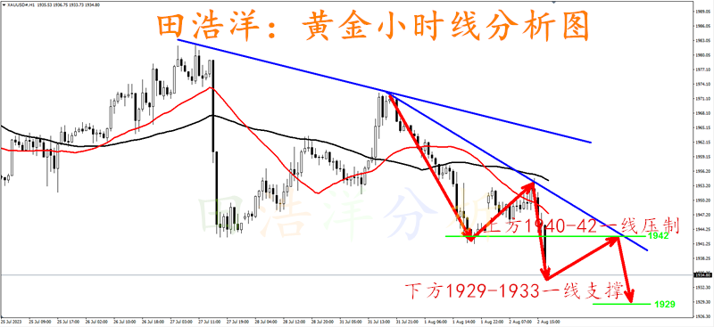 周三美盘时间,受到ADP就业人数利空的影响,金价持续下跌,午后我们内部提前布局的空单已经止盈收割,又是一波利润的斩获,又是数钱的一个晚上!黄金已经跌破1938-1940一线的关键支撑,想必后市大家都知道要做空,但是何时做空成了问题。田浩洋认为当下金价还会继续下跌一定空间,但现在冒然追空的方式不可取,反弹至1940-42一线压力继续空才是稳健的操作策略。即便如此市场还是充斥着大量的抄底资金,他们无所畏惧,但最终的结果想必大家应该心中有数。 从小时分析图来看来看,目前趋势呈现下跌的形态,均线指标呈现死叉向下发散的形态,K线近期反弹至均线附近的概率比较大,但是按照当下的走势来看,今晚应该是不大可能到达1942一线压制,所以机会就给到明天的亚欧盘时间,如果如期反弹,那么通过时间周期来看,均线的压力应该刚好会到达1942附近,与现在的压力位重合,届时做空将会是十拿九稳!空头至少可以看到19230-1933一线,也就是六月底这波上涨行情回撤0.618一线。请大家拭目以待!具体操作策略我会在盘中提示,及时关注。 黄金操作策略: 1、黄金反弹1942-1940附近一线空,止损1948,目标1934-1930一线; 文/田浩洋(VX:thy7818)专业国际市场点评,针对实际市场参与者,考虑到部分市场窗口对于实盘交易具有一定的时效性可关注笔者,从而能够选择合适的策略进行操作。对黄金、原油、白银等大宗商品有深入的研究,如果你做单不顺或投资经常资金缩水,那么你可以关注田浩洋本人。