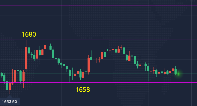 周二黄金高点1679,低点1659。区间为二十美金,如果是按照周二的思路,这里应该不出意外的话应该是有一张多单在手。从另外一个角度来说想要一天之内把高低点全部确立下来也比较痴人说梦。价格没有直接出新低同时也消化了空头继续回踩的动力,最终日线收盘在低点和高点之间,反而是比较靠近低点的现在1664位置。所以接下来周中的涨跌貌似跟本周初的震荡没有什么太大的关系,因为周初是弱震荡。原则上只要1659昨天低点不跌破,行情就有从弱震荡变为区间震荡,会不断的以回调上涨的方式来测试高点直接1711为止,总之经历了周初的走势之后,短期行情我们看法并没有发生改变!