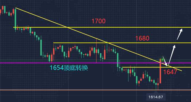 黄金今年从2070高点回撤以来,月线来看,从前期收地缘局势影响大涨飙升之后,月线的BOLL上轨以长上影线收回通道内!随后在美联储加息大背景下,黄金月线从2000大关附近跌至目前临近1610一带水平,连续6个月的收跌,长线的基本面利空因素暂时不会完全解除,因为年低还有2次议息,但上一次的加息依旧结束,所以下一次加息之前,黄金完全是有机会见底的!月底这几天来说1614附近可能属于一个暂时的底部,最终月线以一个较长上影线收尾。 黄金强势转多,4小时中轨之上做多。黄金单边下行趋势,在没有明显反转的前提下,就一直做空。现在黄金反转信号很强烈,已经打破先前的下行趋势。还有一个要确定的是今天黄金收盘价会在1646上方,这就是奠定黄金继续上涨的信号。黄金强势涨破4小时中轨,彻底打破下行趋势,明天4小时中轨之上做多黄金。那么经过以上分析蒋福财得出以下结合,后市黄金的操作思路就很明朗,黄金低多看涨,下方支撑1645-30-上方阻力1680-1700;
