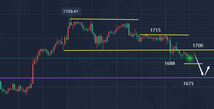 周一(10月10日)亚市盘中,黄金期货延续跌势,期金目前跌至1695美元/盎司附近,日内重挫逾13美元。目前交投于1688美元/盎司附近,上周五美国9月份非农就业报告好于市场预期,强化了美联储将大幅加息的预期,美元和美债收益率大涨并录得三连阳,令金价大幅走弱,不过,金价仍受到地域局势和全球经济衰退担忧的支撑。目前市场预计美国9月通胀放缓,但核心通胀仍将处于高位,投资者需要留意市场预期的变化;美国9月CPI数据将于周四(10月13日)公布。此外,投资者还需留意美联储官员的进一步发言和俄乌地缘局势的相关消息,关注周五(10月14日)出炉的“恐怖数据”——美国零售销售数据。投资需要理智的选择,也需要有人指引,如果你迷茫,我每天18小时在线指导,如果被套,想解套,我会根据你的进场点位、资金大小、合理的解套添加【微信:JFC5458、公众号:蒋福财】为你量身定制翻仓方案。 【黄金走势分析】 上周五的下跌破位形成短期新的走势预期,所以周初从形态上看延续周五的走势是大概率事件,其次目前的走势结构也处于弱势环节。目前的走势结构依旧偏向于弱势,若日内反弹无果,反弹力度较小说明依旧是空头牵制,依旧以看下行走势为主,若反弹上行破位1700以及站稳1700上方,那么后市有望再次走高,而目前依旧以偏弱的形态看待。趋势结构方面,趋势上日线方面大的结构上还是偏弱的行情,但是在下跌过程中呈现的反复走势,就是目前的反弹走势,反弹过后依旧以下跌为主,而短期反弹之后形成往返,走势过程再次呈现较为复杂,而不是单边的形态,故而趋势上目前是一个来回折返的走势波动。 日线结构上,因前一周以及上周连续大幅回升,技术结构支撑得到明显的抬升,虽然非农给行情带来调整,但整体结构上看,此次调整也是技术上所需要的。目前黄金尚且处在短线调整趋势中,技术上也预留了一定的空间,但是并不是很大,本周初下方着重关注10、20日线1685、1677附近支撑测试,只要行情不跌回10、20日线下,技术结构重心上移,就是有利于后期行情再度回升的,而如果行情的确能在10、20日线上方震荡一段时间,则技术形态有望形成头肩底,也会加大后期行情技术上的回升预期。 非农强化美联储再度激进加息预期,美指三连涨,黄金失守1700,所以这次要在1700下方做空黄金。在小时图上,1小时中轨压制金价。黄金探底回升,再次探底,那么1690的支撑就是无效的,这一次金价要跌破1690,寻找新的支撑才能够探底回涨。日内方面布局上还是以高空布局为主,短期走势偏弱,日内黄金操作思路上蒋福财建议反弹上行无果则高空继续看下行延续,点位参考1700一线附近,反弹压制受阻可空继续下看!总的来讲,日内方面还是延续周五的走势预期,继续看下行,若盘面出现反弹上行破位,我们临盘再做调整,短期参考1700一线附近压制情况!目前手上有高位多单或者低位空单,不知道如何处理或者近期出现严重亏损可添加蒋福财老师微信【JFC5458】我会给予最大的帮助。 【黄金操作思路】 一:黄金建议在1695附近参与空,止损1701,目标看1682; 二:黄金建议在1675附近参与多,止损1670,目标看1690; 三:黄金建议在破位1680下方或者破位1705上方我们再顺势择机选择跟进; 四:黄金建议回调到1660参与中线多,目标看1700-1750,防守1648;