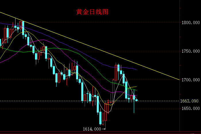 日内操作上,下方建议先关注1654附近支撑,这里是昨天尾盘黄金自1642上涨1672上方的黄金分割0.618位置;其次建议关注1649附近支撑,这里是0.786位置;若行情继续下跌,建议进一步关注1642、1639附近支撑。