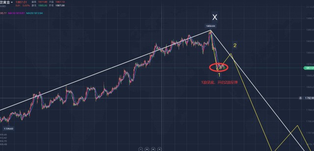 后续走势分析:根据波浪理论可知,Y浪将呈5浪形式展开,1浪底部可先看至1850附近。现行情于1860附近构筑双底形态,我们需对1浪是否见底进行判定,目前行情于1964附近再次录得看涨吞没形态,1浪下行结束,后市可看2浪反弹!