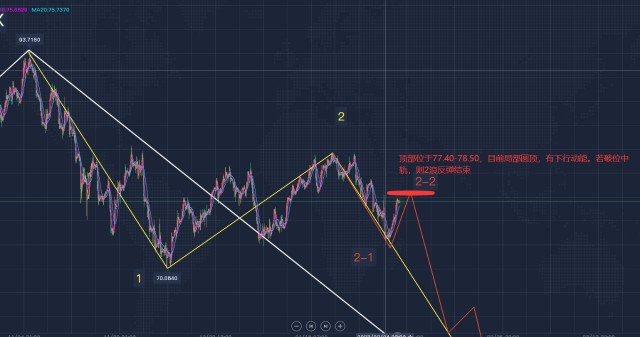 3、3浪细分:为方便分析,我们可将3浪再次细分至5浪结构,如图中红色线所示。依据现有行情可知,行情正处于2-2反弹之中。根据波浪理论推演可知:2-2浪反弹理论顶部位于77.40-78.50区间。目前1小时周期于77.60附近录得看跌吞没形态,2-2浪反弹或已结束,但行情并未突破1小时中轨,其方向仍存在变数。