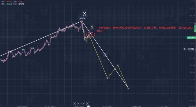 Y浪细分:根据波浪理论可知,Y浪将呈5浪形式展开,1浪底部可先看至1850附近。现行情于1860附近构筑双底形态,我们需对1浪是否见底进行判定,目前行情于1964附近再次录得看涨吞没形态,1浪下行结束,后市可看2浪反弹!根据波浪推演可知:2浪理论顶部位于1910-1920附近!目前1小时周期于1880附近再次录得大阴,构筑塔形顶部形态,且行情破位1880箱体震荡顶部,但并未延续,又破高反跌迹象。2浪或已提前结束!若行情突变,届时我们根据盘面再对波浪进行细分!