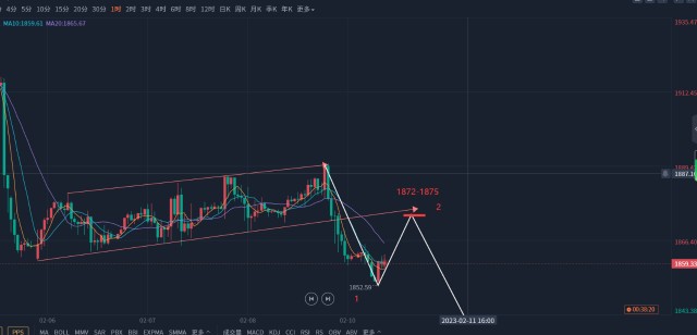 4、波浪结构的小浪细分:目前黄金整体处于Y-3浪下行之中,具体划分依据,有兴趣的朋友可查找之前博文,笔者郭广盈在这里便不再赘述。为方便分析,我们可将Y-3再次细分成5浪结构(至于是否还存在更小的波浪,我们后续再做分析),依据现有行情可知:目前行情已走完3-1浪,行情正处于3-2浪之中。根据波浪理论推演可知:3-2浪理论顶部位于1875附近,于阻力趋势线的点位和阻力位相印证,故我们有理由相信行情将于1872-1875区间再次迎来反转!行情如期于1872附近迎来反转,即3-2浪反弹结束,后市进入3-3浪下行之中,其底部暂不可知!