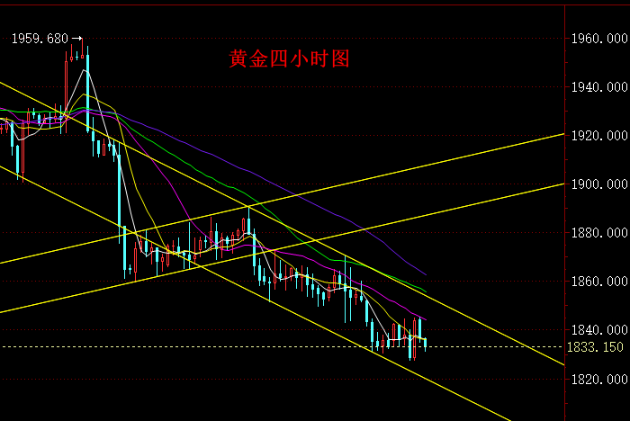 下方短线建议先关注1827附近支撑,昨天美盘两次下探1827后上涨;其次建议关注1820-1815区域支撑,这里是四小时下跌通道的支撑区域;若行情继续下跌,建议进一步关注1800附近支撑,这里是前期顶底转换交易密集区域。