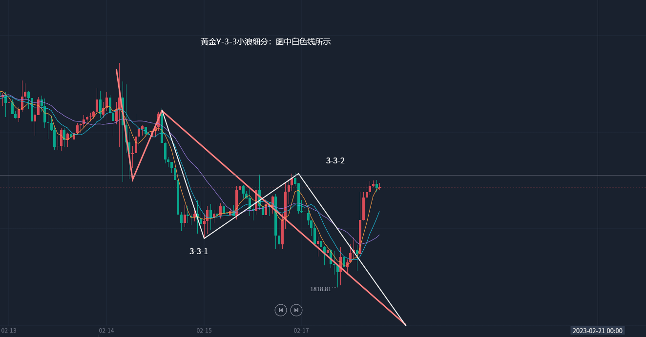黄金波浪结构分析: 1、如前文所述:目前行情整体处于Y浪下行之中,且处于Y-3浪下行之中,后续我们将不再赘述大浪结构,着重针对Y浪的细分浪进行分析!若后续行情破位,我们再另做分析! 2、Y-3浪细分:由之前分析可知,目前行情整体处于Y-3浪下行之中,为方便分析,我们后续再次将Y-3浪再次细分成5浪结构,如图中红色线所示。依据现有可知,郭广盈判定3-1浪和3-2浪已完成,现行情处于3-3浪加速下行之中。为方便分析,我们可将3-3浪再次细分成5浪结构,依据现有行情可知,行情已走完3-3-1浪,我们需对3-3-2浪的顶部进行判定。根据波浪理论推演可知:3-3-2浪理论反弹顶部位于1860附近,目前行情最高企及1860一线,且于阻力位1856附近构筑看跌吞没形态,短线反弹结束即3-3-2浪反弹结束,后市看3-3-3加速下行,配合1小时周期的旗形看跌形态可知其理论底部位于1790附近。