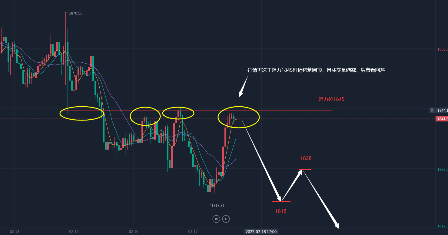裸k盘面分析: 1小时周期自1959起的行情整体可视为旗形看跌形态,如图中白色箭头所示。根据相关理论可知其理论底部位于1790附近。目前局部于1818附近录得圆底形态后,后续收阳破位1小时中轨上行,现局部于1845附近再次录得一系列的纺锤线和小实线呈震荡,圆顶形态初显,且1845为前市强阻力位,后市可看下行,1845亦是下周空单入场点位。4小时周期局部于1818附近录得启明星形态,后续收阴破位中轨,但成交量异常,且1845为前市阻力,建议后市谨慎追多。日线周期局部于1872附近录得一系列的纺锤线表现为震荡,圆顶形态初显,现再次录得小实线和纺锤线表现为震荡下行,后市仍可继续看下行。上方关注1845短线阻力情况,破位看1856-1872;下方关注1818-1800支撑,破位看1790! 目前1小时周期的Ma均线交叉向上指向看涨,后市看下行;但行情若不破1845一线,则行情处于1845-1818震荡之中,震荡区间的均线效用有限。1小时周期KDJ交叉向上指向看跌,但目前已处于超买状态之中,后市需关注其超买状态的解除方式;15分钟周期的KDJ交叉向下指向看跌,短线可看下行。1小时周期的RSI并未随行情新低而创新低,短线呈底背离,目前行情已反弹,高位谨慎追多!目前1小时周期的成交量逐步缩减,反转在即,后市可看下行! 综上:若不破1845一线,后市行情将以震荡或者下行展开,但考虑旗形看跌形态的下行阶段底部,建议后市仍以高空为主,低多为辅。