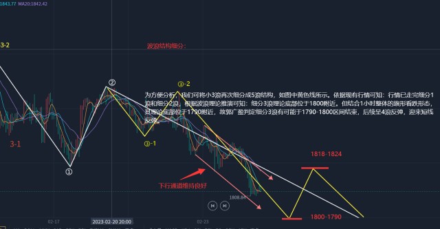 黄金现货行情分析: 1、关于下行通道的说明:由之前分析可知,目前1小时周期处于由1833和1830构筑的上方阻力趋势线,及由1823和1817构筑的下方支撑趋势线组成的下行通道之中。行情虽短线逾越下行通道,但后续局部于1826附近再次录得圆顶形态后收阴再次进入下行通道,下行通道有效,行情仍处于阶段性下行过程中,后市行情触及上轨和下轨时可高空低多,但整体建议高空为主,低多为辅! 2、1小时周期局部于1826附近再次录得圆顶形态,后市录得一系列的阴线呈下行;现于1810附近接连录得小实线和纺锤线呈盘整,局部有企稳迹象,但并未见明显的反转形态,故后市建议仍以高空为主。目前1小时周期整体处于下行通道之中,且呈阶段性下行之中,后市可看下行。由极性转换原则可知:1818作为前市强支撑位,目前行情收阴下破该点位,1818可视为短线阻力;1824作为前市多空转换点位,目前亦转换至短线阻力,故后市需关注1818和1824这两个点位的阻力情况。4小时周期局部于1830附近录得圆顶形态后,目前再次录得阴线构筑看跌吞没形态后收阴破位1818支撑,且行情仍处于中轨之下,后市建议仍以高空为主。日线周期继续录得阴线,后市仍可看下行。上方关注1818-1824-1833阻力,下方关注1800-1790-1770支撑! 3、指标分析:1小时周期的ma均线交叉向下指向看跌,后市整体可看下行。1小时周期和15分钟周期的KDJ交叉向下指向看跌,后市整体可看下行;但目前1小时周期和15分钟周期的KDJ皆已触及超卖分界线,后市需关注其超卖状态的解除方式(因行情处于下行通达之中,行情大概率将呈震荡缓解超卖状态)。1小时周期的RSI随行情新低(1808)而创新低,并未见背离信号,后市可继续看下行。1小时周期的成交量并未见异常,后市继续看下行。 4、旗形看跌形态:由之前分析可知,自1959起的行情可视为旗形看跌形态,其形态划分可参考之前博文,在这里郭广盈不在赘述。根据相关理论推演可知:自1890起的下行阶段的理论底部位于1790附近,即下行阶段将于1790附近结束,行情或将于1790附近迎来一次反弹。 5、波浪细分:由之前分析,我们可知行情正处于3-3-3浪加速下行之中,其底部暂不可知。为方便分析,我们可将3-3-3浪再次细分,依据现有行情可知行情已走完小1浪(为简化波浪结构,我们只截取3-3-3浪型部分进行分析),行情正处于小2浪反弹之中,如图中白色线所示,目前我们需对小2浪的顶部进行判定。根据波浪理论推演可知:小2浪的顶部理论位于1844附近,现行情于1845附近录得平顶形态,行情如期于1845附近迎来反转,故我们可判定小2浪反弹结束,后市进入小3浪加速下行之中。依据现有行情,我们可将小3浪再次细分成5浪结构,如图中黄色线所示,根据波浪结构推演可知:此次细分3浪理论底部位于1800-1790附近,结合前文分析,我们有理由相信:行情将于1790-1800区间迎来一次短线反弹。 综上:行情仍处于看跌形态之中,建议后市高空为主,低多为辅!