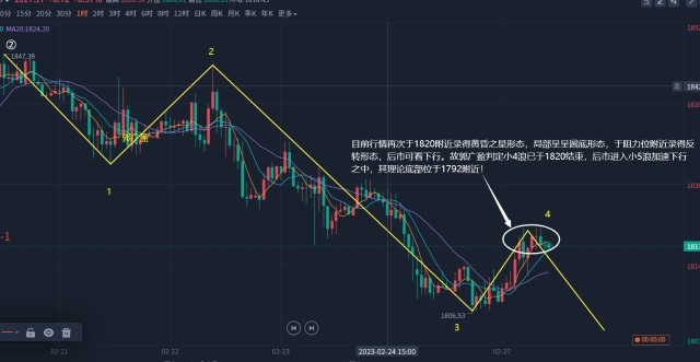 小浪细分:由之前分析可知,目前行情整体处于Y-3浪加速下行之中,且处于我们对Y-3-3-3之中。为方便分析,郭广盈建议将3-3-3浪再次细分,如图中黄色线所示,目前1小时周期于1806附近构筑w底形态,局部下行结束,故小3浪或于1806附近提前结束,行情整体处于小4浪反弹之中。根据波浪理论推演可知:小4浪的理论顶部位于1820附近。因行情于1820附近录得反转形态,契合小浪顶部的理论顶部1820,故郭广盈判定小4浪已于1820附近结束,后市进入小5浪下行之中,根据波浪推演可知:小5浪理论底部位于1792附近。