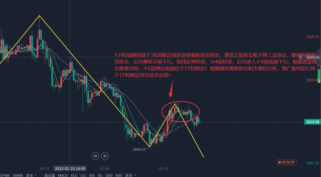5、波浪细分:由之前分析可知,目前行情整体处于Y-3浪加速下行之中,且处于我们对Y-3-3-3之中。为方便分析,郭广盈建议将3-3-3浪再次细分,如图中黄色线所示,因1小时周期于1806附近构筑w底形态,局部下行结束,故小3浪或于1806附近提前结束,行情整体处于小4浪反弹之中。根据波浪理论推演可知:小4浪的理论顶部位于1820附近。因行情于1820附近录得反转形态,契合小浪顶部的理论顶部1820,故郭广盈判定小4浪已于1820附近结束,后市进入小5浪下行之中,根据波浪推演可知:小5浪理论底部位于1792附近。根据旗形看跌形态和支撑位分析,我们可判定行情将于1790附近再次迎来反转!
