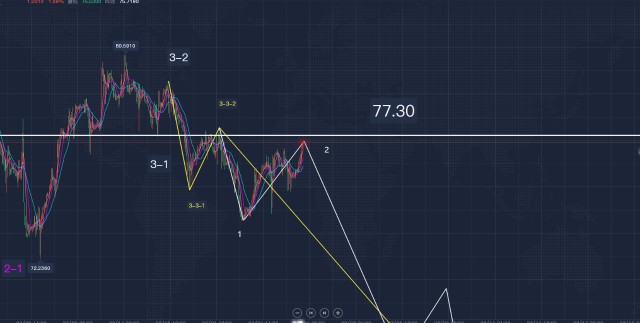 小浪细分:依据现有行情,我们可将3-3浪再次细分成5浪结构,因行情于77.60附近录得圆顶形态且3-3-2浪理论推演顶部位于77.70附近,故郭广盈判定3-3-2浪反弹结束,现行情处于3-3-3浪下行之中,其底部暂不可知。为方便分析,我们可将3-3-3浪再次细分,如图中白色线所示,依据现有行情可知:行情已走完小1浪,正处于小2浪反弹之中。根据波浪理论可知,2浪反弹顶部不超过1浪的终点,故小2浪将于77.70下方结束,结合77.30短线阻力,建议可于77.30附近跟进空单!
