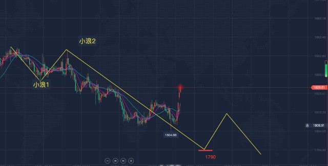 由之前分析可知,目前行情整体处于Y-3浪加速下行之中,且处于我们对Y-3-3-3之中。为方便分析,郭广盈建议将3-3-3浪再次细分,如图中黄色线所示,因1小时周期分别于1806附近构筑w底形态和1820附近录得圆顶形态,故我们暂判定小3浪和小4浪结束,后市处于小5浪加速下行之中。现行情再次筑底于1804附近后上行破位1820一线最高企及1828一线,故我们需对小浪结构重新进行划分。若判定小5浪于1804附近提前结束,则3-3-3浪于1804附近提前结束,行情处于3-3-4浪反弹之中。但根据波浪理论可知:4浪不会进入2浪的价格区间,因3-3-2浪的价格区间为1819-1847,3-3-4浪已处于2浪的价格区间,不符合波浪理论,故小浪结构划分错误。即行情仍应处于小浪3加速下行之中,其理论底部仍位于1790附近!