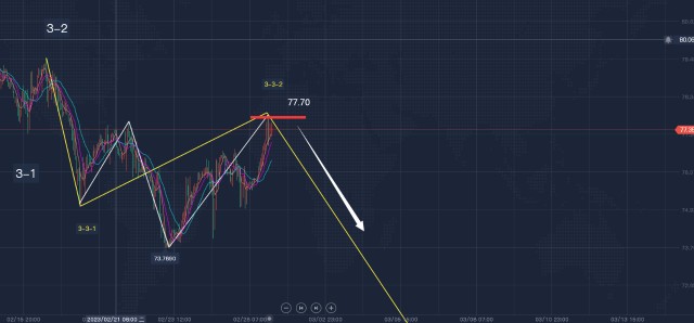 小浪细分:依据现有行情,我们正处于Y-3浪加速下行之中。为方便分析,我们可将Y-3-3浪再次细分成5浪结构,如图中黄色线所示,且行情已走完3-3-1浪之中,行情正处于3-3-2浪反弹之中。依据现有行情可知:3-3-2浪呈顺势三角形展开,如图中白色线所示。根据波浪理论可知:3-3-2-c浪将于a浪附近结束,即77.70附近结束。目前行情于77.70附近录得看跌吞没形态后,后续再次录得一系列上影线较长的k线,c浪反弹或已结束,后市可看3-3-3浪加速下行。故建议可于77.70附近高空为主。