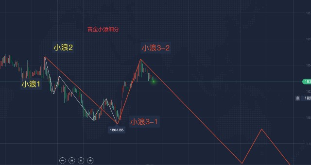 4、小浪细分:由之前分析可知,目前行情整体处于Y-3浪下行之中,为方便分析,我们这里不再对大浪进行赘述,继而只对小浪进行细分。依据现有行情可知:自1847起的小浪3可继续细分成5浪结构,如图中红色线所示。现行情已走完小浪3-1和小浪3-2,行情正处于小浪3-3浪加速下行之中,因小浪3-1为延长浪,根据波浪理论可知:4浪不会进入2浪的价格区间,即4浪反弹高点不会逾越1804一线,因此郭广盈判定小浪3-3浪必将加速下行至1800下方。故建议后市整体高空为主,低多为辅!