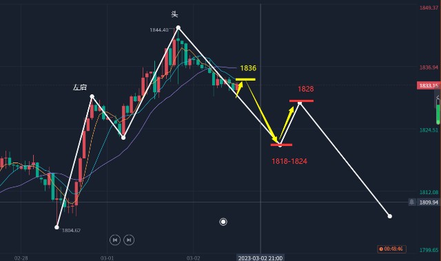 2、自1804起的行情整体可视为头肩顶形态,如图中白色线所示。目前行情已走完左肩(1828)和头部(1845)形态,现行情处于右肩形成阶段,即行情刺破1828一线后会再次迎来一次短线反弹至1828-1833附近完成右肩形态,继而暴跌下行至1800下方