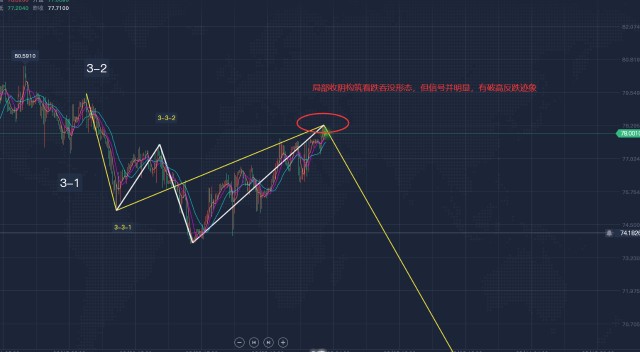 小浪细分:依据现有行情,我们正处于Y-3浪加速下行之中。为方便分析,我们可将Y-3-3浪再次细分成5浪结构,如图中黄色线所示,且行情已走完3-3-1浪之中,行情正处于3-3-2浪反弹之中。依据现有行情可知:3-3-2浪呈顺势三角形展开,如图中白色线所示。根据波浪理论可知:3-3-2-c浪将于a浪附近结束,即77.70附近结束。目前行情局部处于76.50-77.70箱体震荡之中,现行情虽短线上行破位震荡顶部,但局部收阴构筑看跌吞没形态,有破高反跌迹象,建议可于78.00附近跟进空单,止损78.90,中长空持有!