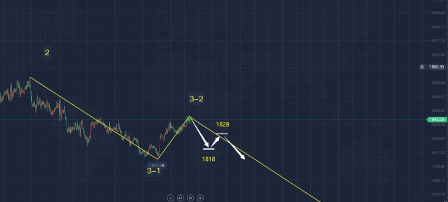 由之前行情分析可知:目前行情整体处于Y-3浪加速下行之中,在这里郭广盈便不再赘述大浪结构,继而对小浪进行细分。为方便分析,郭广盈依据现有行情将Y-3浪再次细分成5浪机构,如图中黄色线所示。现行情已走完3-1浪(1890-1805),正处于3-2浪反弹之中,根据波浪理论推演可知:3-2浪理论顶部位于1838-1872区间,但一般我们倾向选取1浪幅度的斐波那契倍数0.5的这个位置即1847。1845为前市强阻位置,故我们有理由相信行情将于1845附近再次迎来反转!