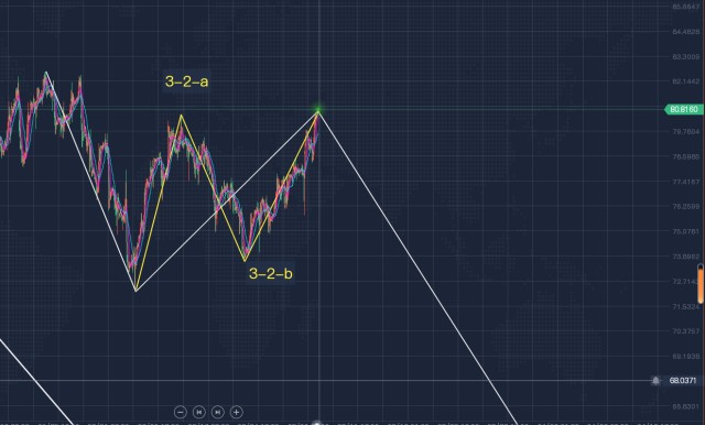 因行情再次破位80.59一线,原油波浪小浪结构破位,我们需对其波浪结构再次进行划分,其原有大浪结构保持不变,即自93.71起的行情可视为Y浪下行,依据现有行情可将Y浪细分成5浪结构且行情正处于Y-3浪下行之中。为方便分析,我们可将Y-3浪再次细分成5浪结构,现行情处于Y-3-2浪反弹之中且Y-3-2呈调整浪展开,如图中黄色线所示。根据波浪理论推演可知:c浪一般等长于a浪,即c浪理论顶部位于82.14附近,目前行情于80.00上方局部录得圆顶形态,整体构筑m顶形态,c浪或以提前结束,即3-2浪反弹结束,后市可看3-3浪加速下行!空单可于77.60附近跟进或者配合1小时周期的ma均线和15分钟周期的KDJ指向入场空单!