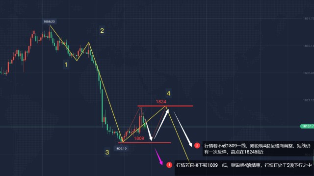 小浪细分:根据现有行情,我们可将Y-3-3浪的细分浪1浪再次细分成5浪结构,即自1858起的行情可细分成5浪结构,如图中黄色线所示。目前行情已走完1浪、2浪和3浪,行情正处于4浪反弹之中。根据波浪理论推演可知:4浪的理论反弹顶部位于1825附近。目前行情最高企及1824附近,且行情于阻力位1824附近录得黄昏之星形态,短线反弹结束,后市可看下行。但根据波浪可知,4浪一般会呈锯齿浪或者呈横向调整展开,故目前判定4浪反弹结束仍为时尚早。若后续行情下破不破1810一线,则4浪并未结束而是将呈横向调整展开,即行情仍会上行至1824附近后完成4浪,后续再次进入5浪下行;若行情直接下行破位1809一线,则说明4浪反弹结束,行情正处于5浪下行之中,其理论底部可看1800-1790区间!