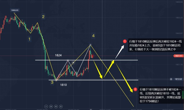 5浪理论底部:根据波浪理论可知,若5浪不存在细分浪,则5浪底部理论位于1811附近,5浪将不会超过3浪的起点,即5浪将缩短提前完成;若5浪呈延长浪展开,则其理论底部位于1756附近!故1809和1824这两个点位仍是后市多空转折点位!