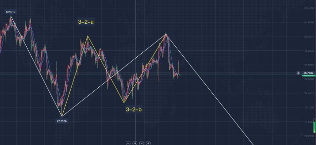 因行情再次破位80.59一线,原油波浪小浪结构破位,我们需对其波浪结构再次进行划分,其原有大浪结构保持不变,即自93.71起的行情可视为Y浪下行,依据现有行情可将Y浪细分成5浪结构且行情正处于Y-3浪下行之中。为方便分析,我们可将Y-3浪再次细分成5浪结构,现行情处于Y-3-2浪反弹之中且Y-3-2呈调整浪展开,如图中黄色线所示。根据波浪理论推演可知:c浪一般等长于a浪,即c浪理论顶部位于82.14附近,目前行情于80.00上方局部录得圆顶形态,整体构筑m顶形态,c浪或以提前结束,即3-2浪反弹结束,后市可看3-3浪加速下行!空单可于77.70附近跟进或者配合1小时周期的ma均线和15分钟周期的KDJ指向入场空单!