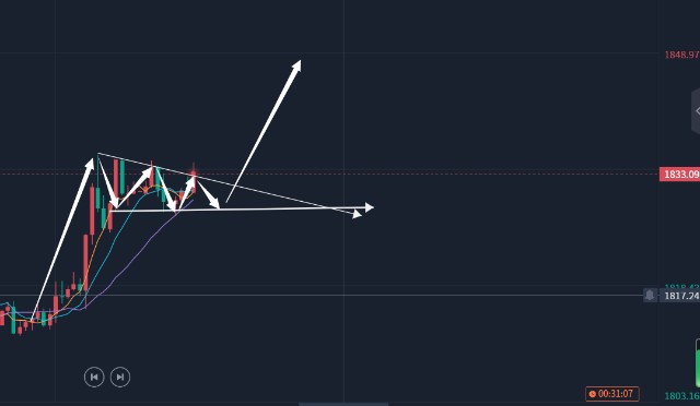 1小时周期于1827-1835区间录得一系列的k线呈盘整,局部自1812其的行情可视为旗形看涨形态,如图中白色箭头所示,上涨(1812-1835)-盘整(1835-1827)-上涨(1827-理论顶部位置1850),即后市仍有一次上行。1845-1850作为前市多空转换较频繁的点位,根据极性转换原则,1845-1850已转换成后市阻力,故今日上方阻力关注1845-1850区间!目前1小时周期的ma均线和15分钟周期的KDJ皆指向看涨,建议可先看涨至1845-1850区间,再抉多空!
