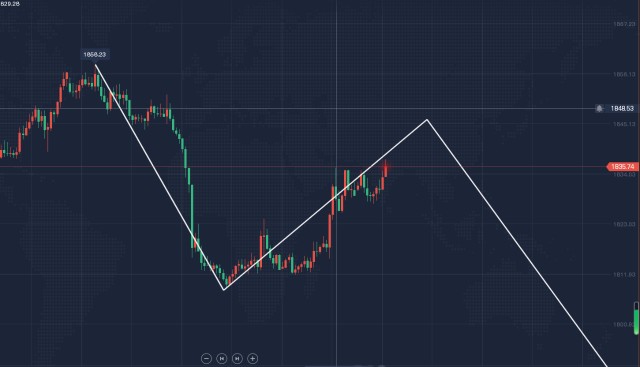 Y-3-3浪细分:为方便分析,依据现有行情,我们可将3-3-3浪再次细分成5浪结构,如图中白色线所示,现行情已走完1浪(1858-1809),因行情于1809附近录得双底形态,1浪回落结束,现行情正处于2浪反弹之中。根据波浪理论推演可知:2浪一般反弹1浪的0.618,即2浪理论顶部位于1840附近。现1小时周期的行情局部于1828-1835区间呈收缩三角形形态,后市仍有一次反弹。