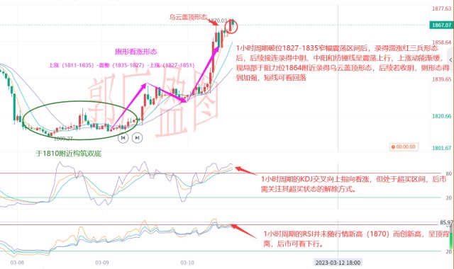 1小时周期局部向上突破1827-1835窄幅震荡区间后录得指向滞涨红三兵形态,后续接连录得中阴、中阳及纺锤线呈上行,现局部再次于1870(1866为前市多空转换较为频繁的点位,目前可视为短线阻力)附近录得乌云盖顶形态,若后续收阴于1866下方,则形态加强,后市可看下行。4小时周期局部录得大阳触及阻力位1866后,后续录得十字线和长上影线的阳线呈滞涨,高位谨慎追多。1小时周期于1804-1860区间接连录得反转形态,目前可判定为震荡,建议高空低多处理。建议上方关注1874-1890短线阻力,下方关注1845-1830短线支撑,破位看1810!