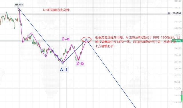 小浪细分:为方便分析和简化波浪结构,我们可将视线再次转移至1小时周期的波浪结构。由大一级别的波浪结构分析,目前行情正处于A-2浪反弹之中,且A-2浪呈横向调整,故其细分浪如图中粉色线所示,行情正处于2-c浪反弹之中,其理论顶部位于1863附近(2-c浪一般等长于2-a浪)。结合大级别的A-2的顶部推演,我们可判定A-2浪的理论顶部位于1863-1900区间,其实际顶部需结合盘面信号确认。目前盘面顶背离信号初显,顶部确认在即,令人激动的反转即将到来!