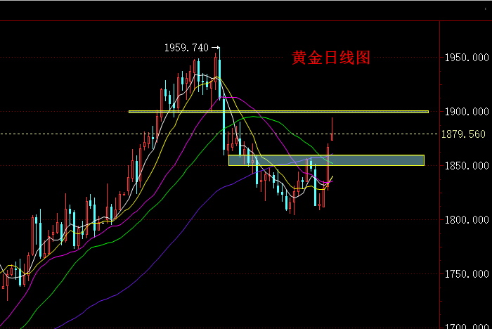 上方去关注1900,前期我们也是建议看涨1900,只是因为行情短期的反复,因此短期调整思路去关注下跌通道情况。上周五黄金强势上涨突破下跌通道,那么就顺应市场继续去看涨黄金。1900附近是黄金自1960下跌1804的黄金分割0.618位置,也是前期高位震荡的低点位置。